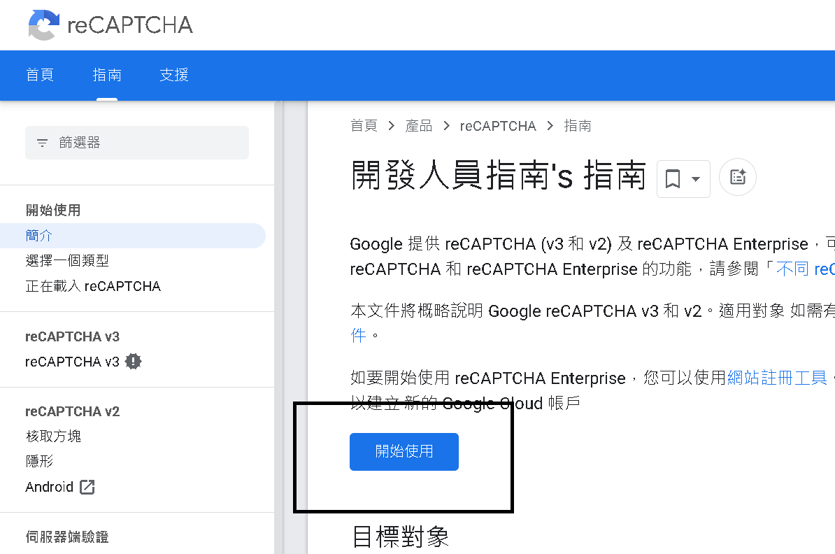 登入Google reCAPTCHA網站,我們要註冊新的金鑰 -> 開始使用