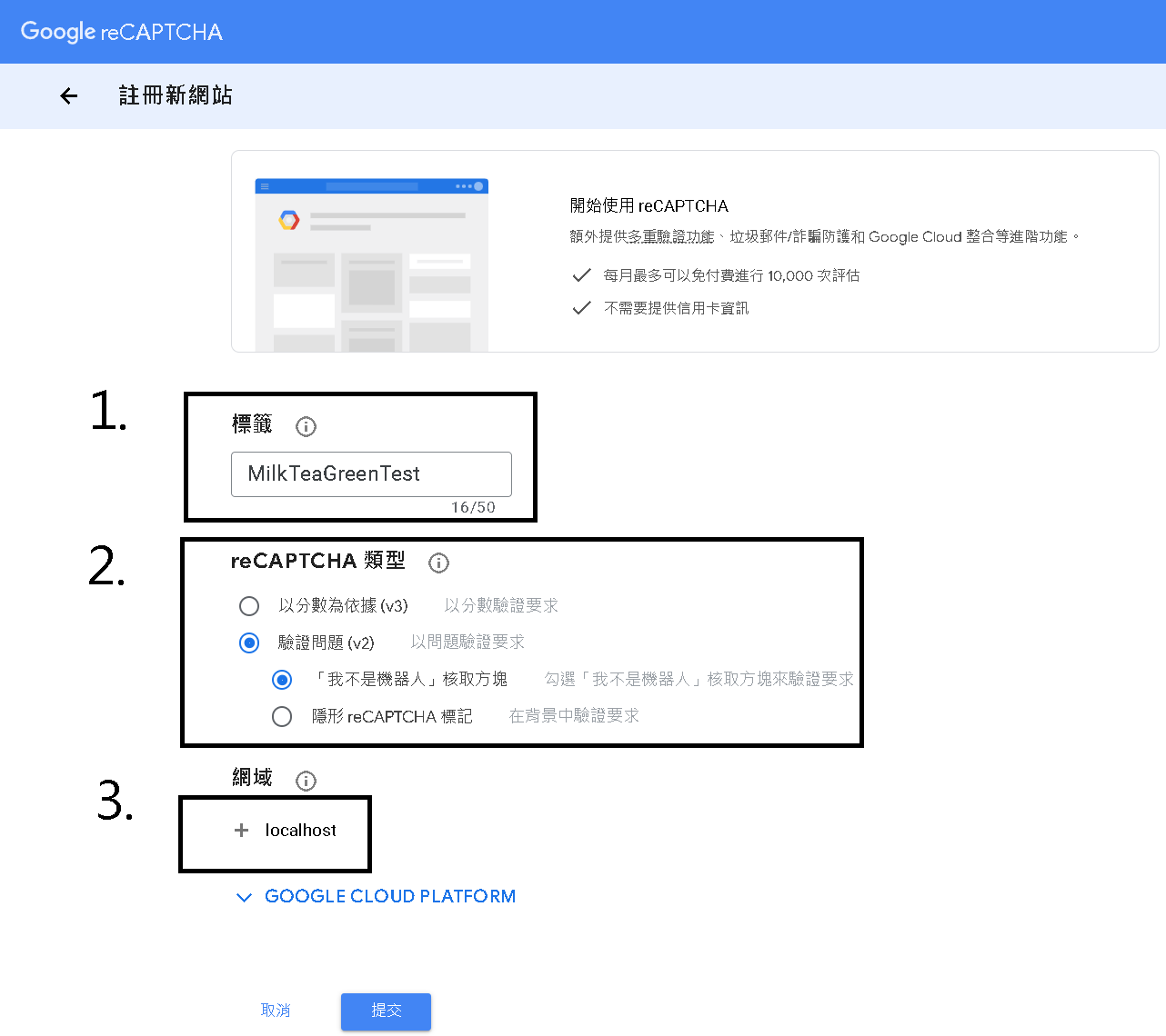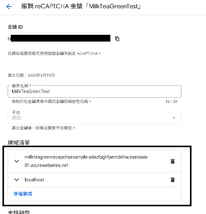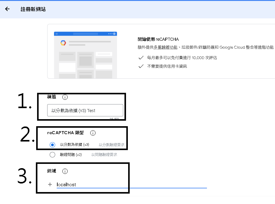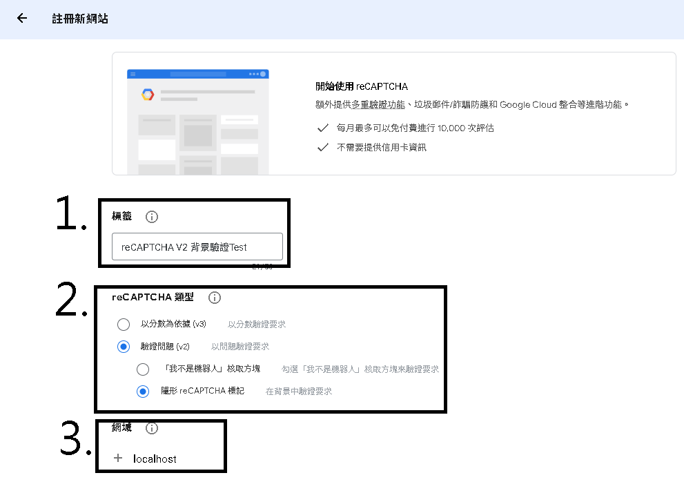 網域填寫:localhost ,這會用於開發者在 DEBUG 模式下可以驗證 reCAPTCHA 是否符合預期