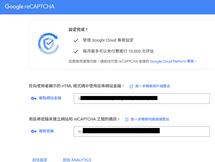 接著會跳轉到設定完成,請將畫面上的 網站金鑰、密鑰 記錄下來