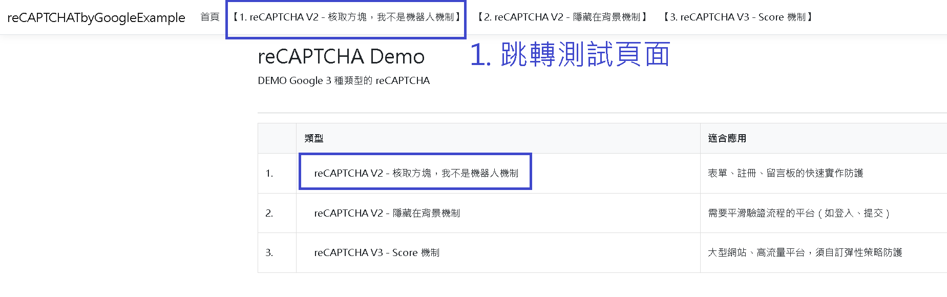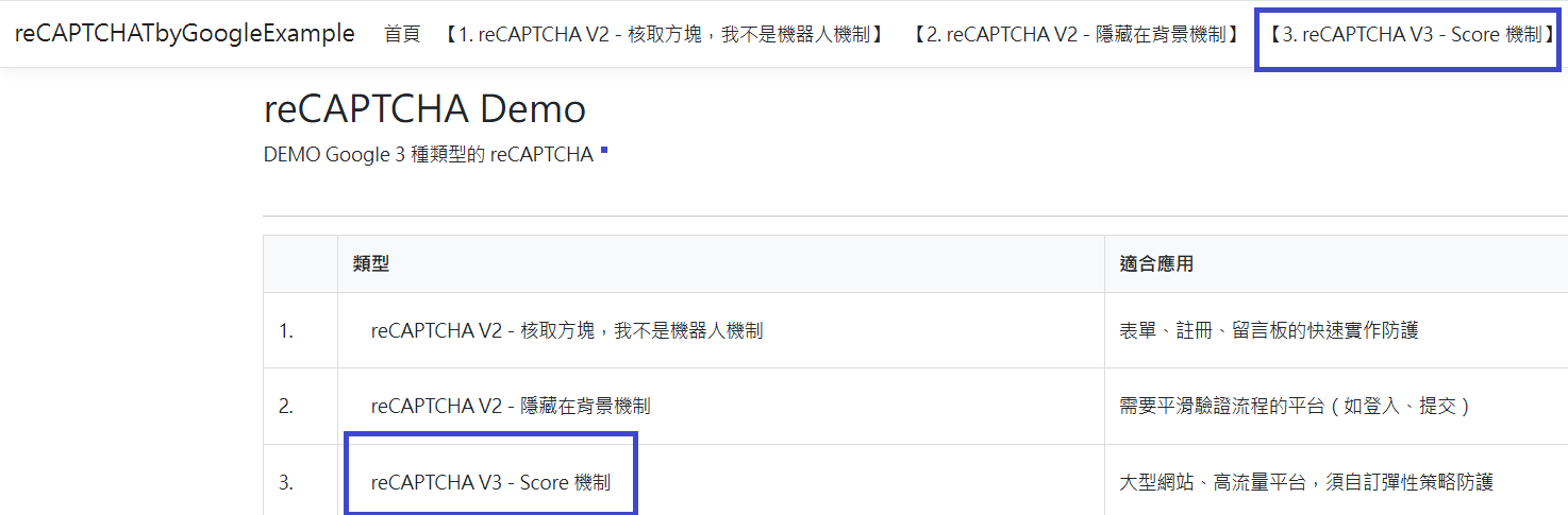 // 1. 進入 reCAPTCHA v3 測試頁面