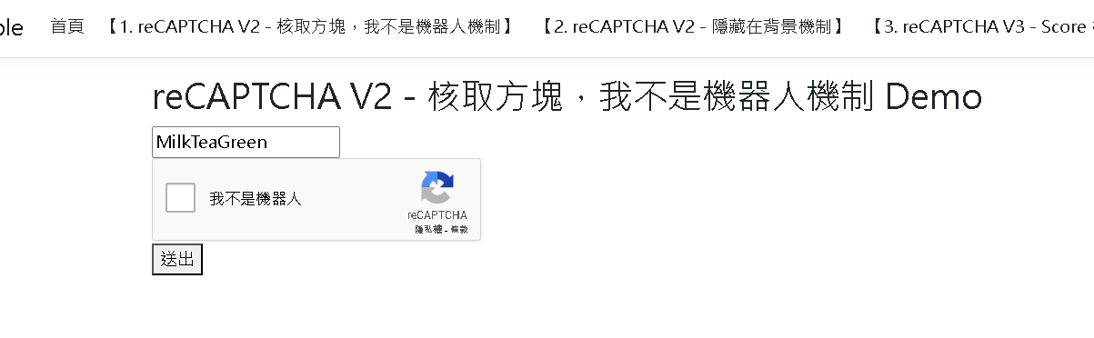 <h2>reCAPTCHA V2 - 核取方塊,我不是機器人機制 Demo</h2>