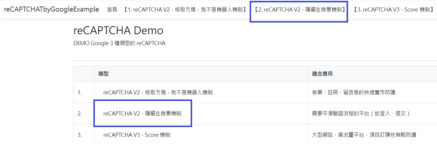 在Google的reCAPTCHA參考指南裡,列出3種方案類型功能說明: