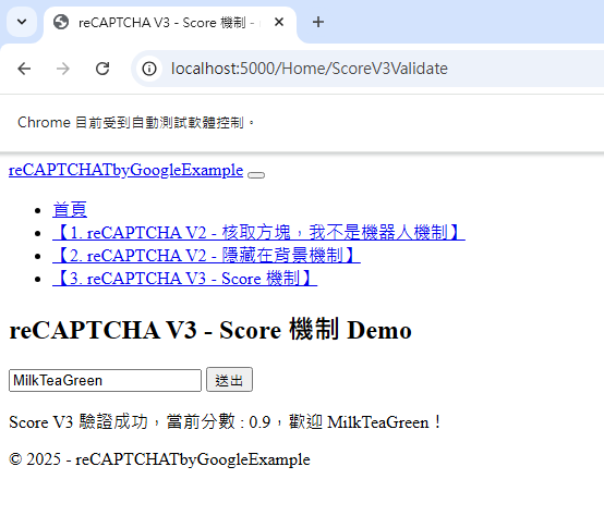 ViewBag.Message = $"Score V3 驗證成功,當前分數 : {captchaResult.score},歡迎 {Username}!";