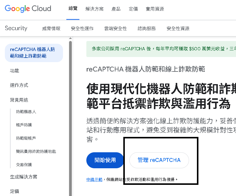 | 開發者整合 reCAPTCHA 後台(GCP) | Google Cloud Platform (GCP) 的產品頁與管理入口,在這裡建立的 key,通常是 Enterprise 版,而不是免費的 reCAPTCHA |