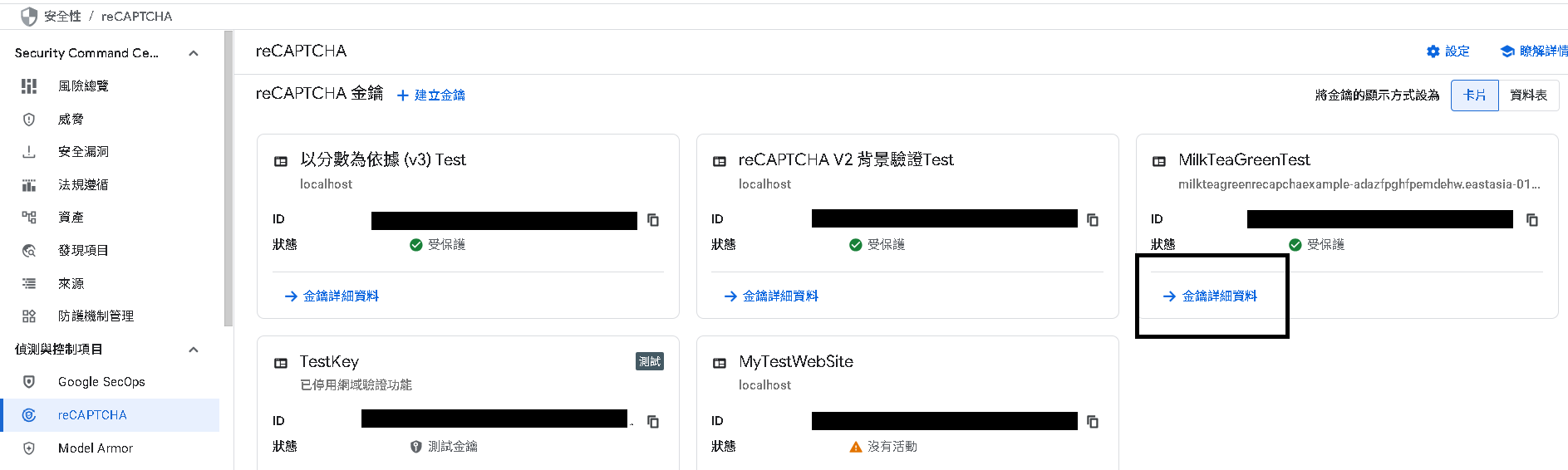 | 原始 reCAPTCHA 管理後台 | 功能比較單純、早期(v1、v2、v3)都是從這裡建立與管理網站金鑰、目前仍從這邊建立網站金鑰、密鑰 |