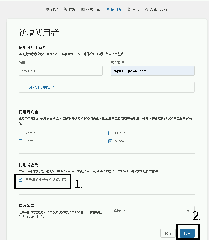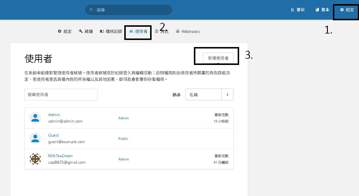 登入 BookStack 後 -> 設定 -> 使用者 -> 新增使用者