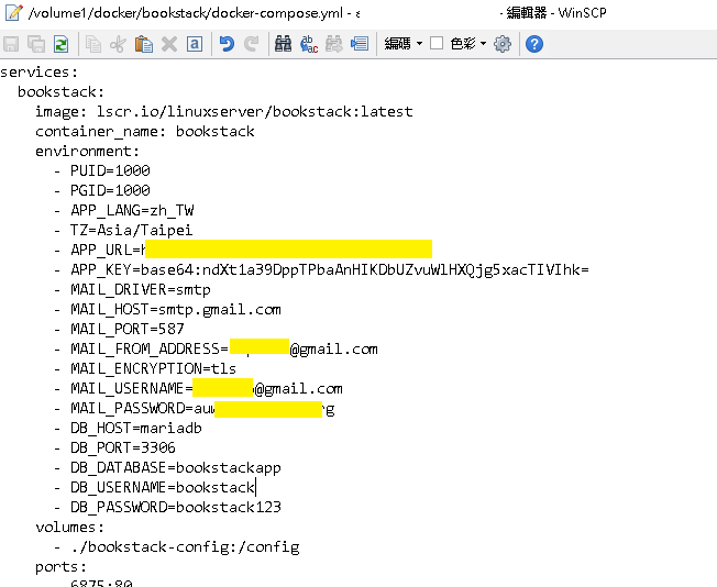 然後將 docker-compose.yml 添加以下資訊,其中 {} 都是要替換的地方