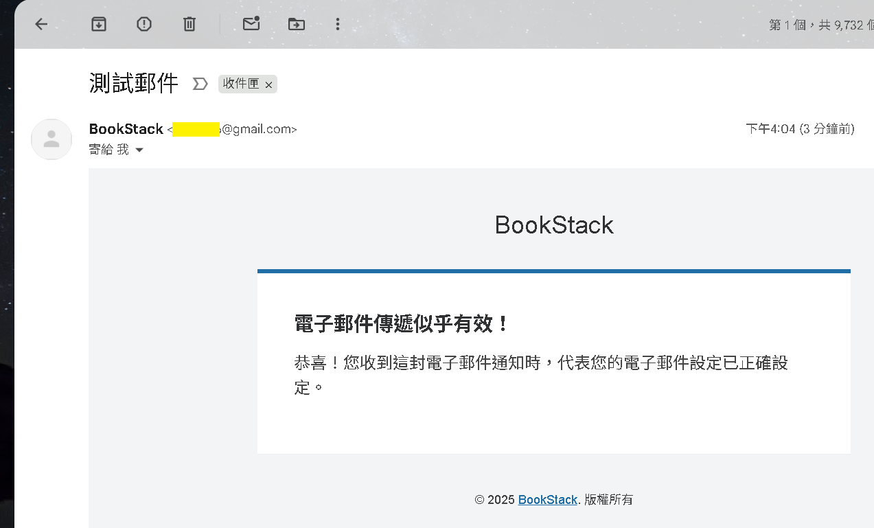 EX: 我是用 Cap8825@gmail.com 登入 BookStack 執行測試信,就會從此 Gmail 收到測試信