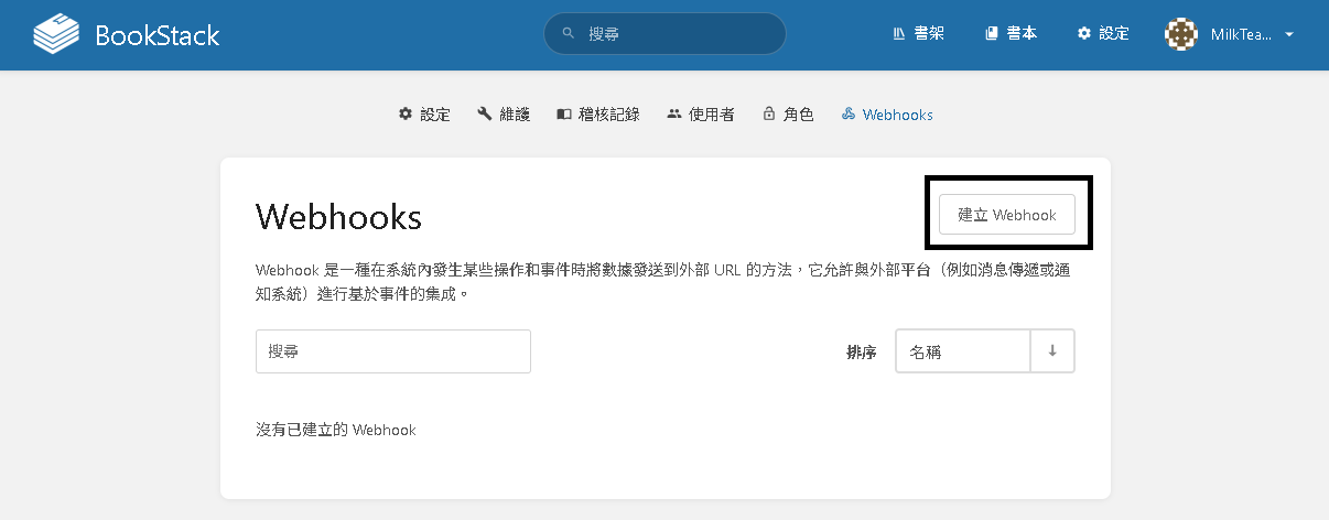 登入 BookStack 後 -> 設定 -> Webhooks -> 建立 Webhook
