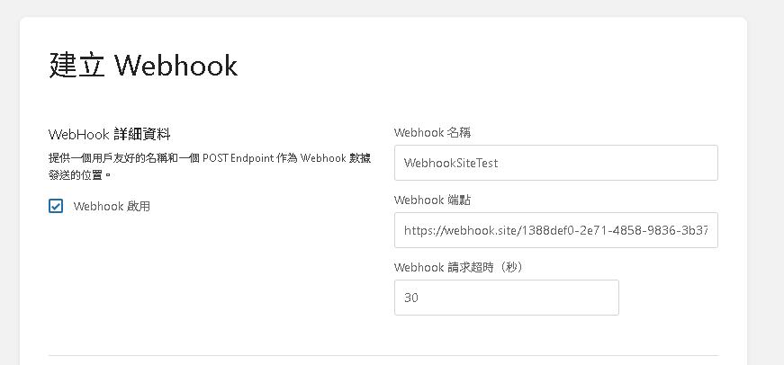 將從 webhook.site 得到的 unique URL 貼上 -> 保存