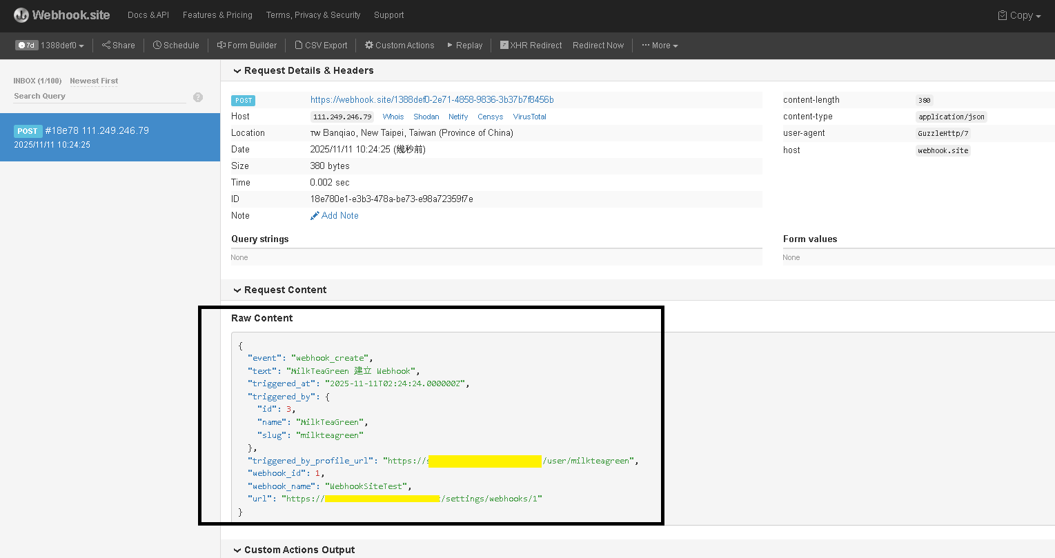回到未關閉的 Webhook.site 可以看到發送的結果,裡面的發送來源為 Tailscale Funnel 獲取的域名 (NAS 上架設的 BookStack 對外訪問域名)