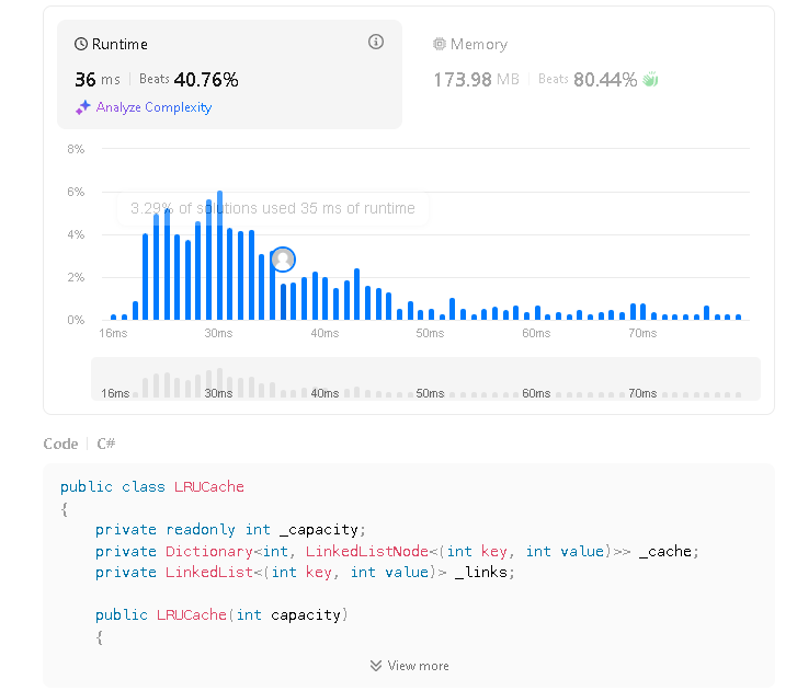 private readonly Dictionary<int, LinkedListNode<(int key, int value)>> _cache;