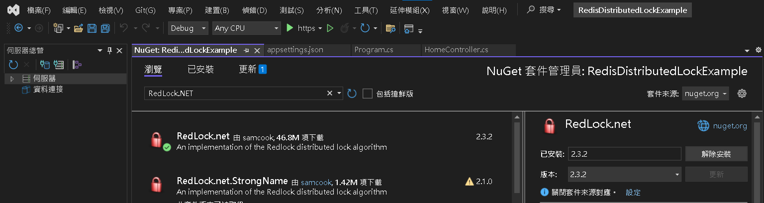 Nuget 安裝以下套件,RedLock.NET 是主流的 Reids 分布式套件,但相依於 ExchangeRedis