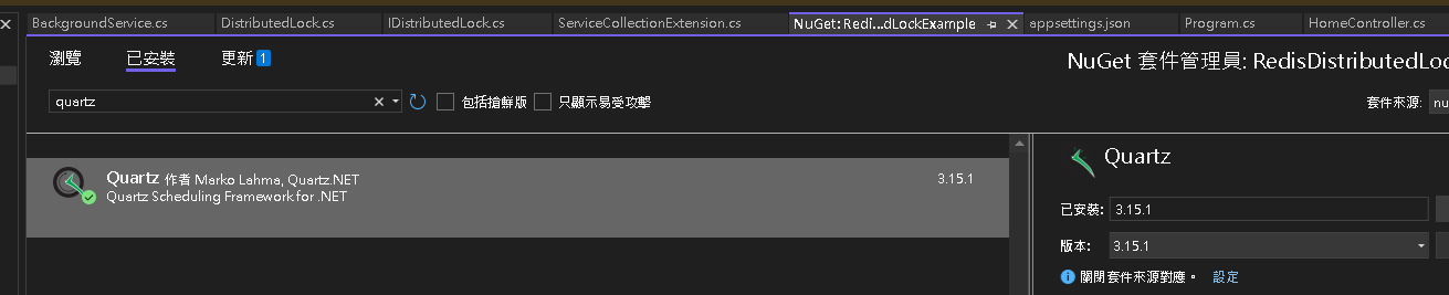 Nuget 安裝以下套件,Quartz.NET 是高效能的排程套件,並且可以精確到微秒等級的執行時間