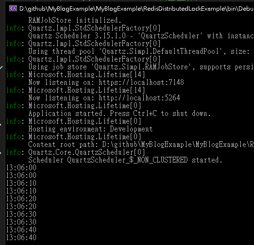 會透過 Quartz.NET 精確地讓兩個服務同時觸發同個業務,這時若 Redis 分布式鎖有效,那麼就只會有一筆資料寫進到 Mysql 資料庫中