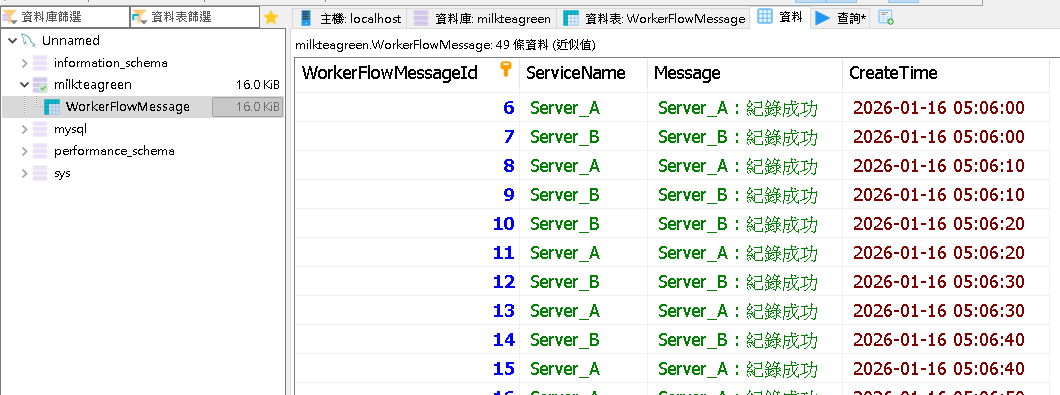 啟動後, 2 個 Job 每 10 秒同時啟動,並且會各自寫到資料庫,我們預期只會有一筆資料寫進資料庫中