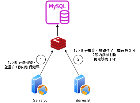 | 2. Server B | : | 17:40 看到被鎖了,但是阻塞式鎖可以等待 2 秒,剛好 ServerA 在1秒內做為,輪到我工作了 |