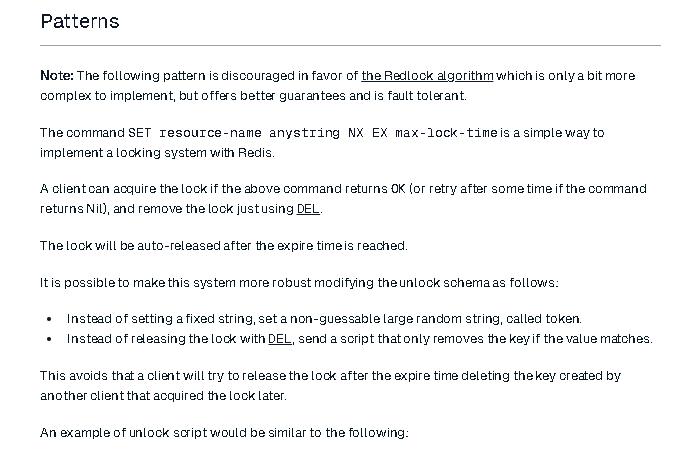 往下拉到 Pattern 的地方,可以看到官方的建議(簡化意思): 不建議用這個鎖法,建議用 RedLock 的鎖,有更好的保證與容錯能力