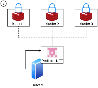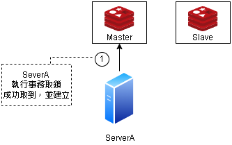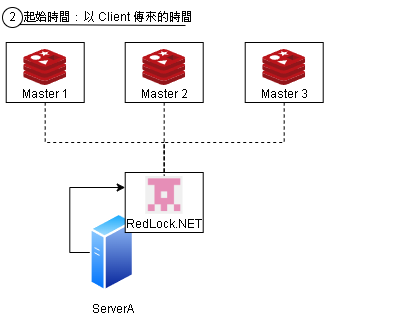| 2. RedLock 取得請求 | 透過 Server A 傳來的 TTL 存取時間,在 3 台 Master 確認是否可建立鎖 |