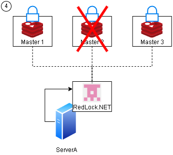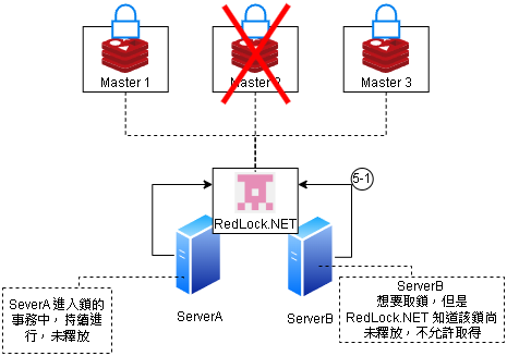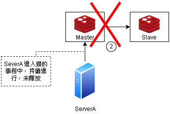 我們接著假設 3 台 Master Redis 機器有壞掉的情況,現在 Master 2 異常,但 Server A 已經取得鎖在執行事務 未釋放鎖