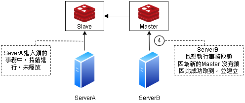 | 4. Server B 請求鎖 | Server B 也想執行相同的事務,呼叫 Master (原Slave),確認沒有鎖,成功拿到 鎖進行事務 |