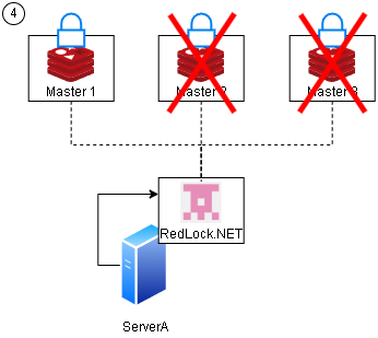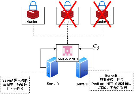我們接著假設 3 台 Master Redis 機器有壞掉的情況,現在 Master 2,3 異常,但 Server A 已經取得鎖在執行事務 未釋放鎖