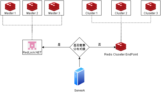 因此要符合 RedLock 的分布式需要至少 3 台,獨立的 Master Redis ; Cluster Redis 只能視為 1 個