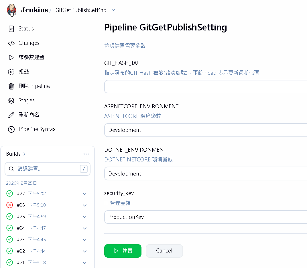 string(name: 'ASPNETCORE_ENVIRONMENT', defaultValue: 'Development', description: 'ASP NETCORE 環境變數')