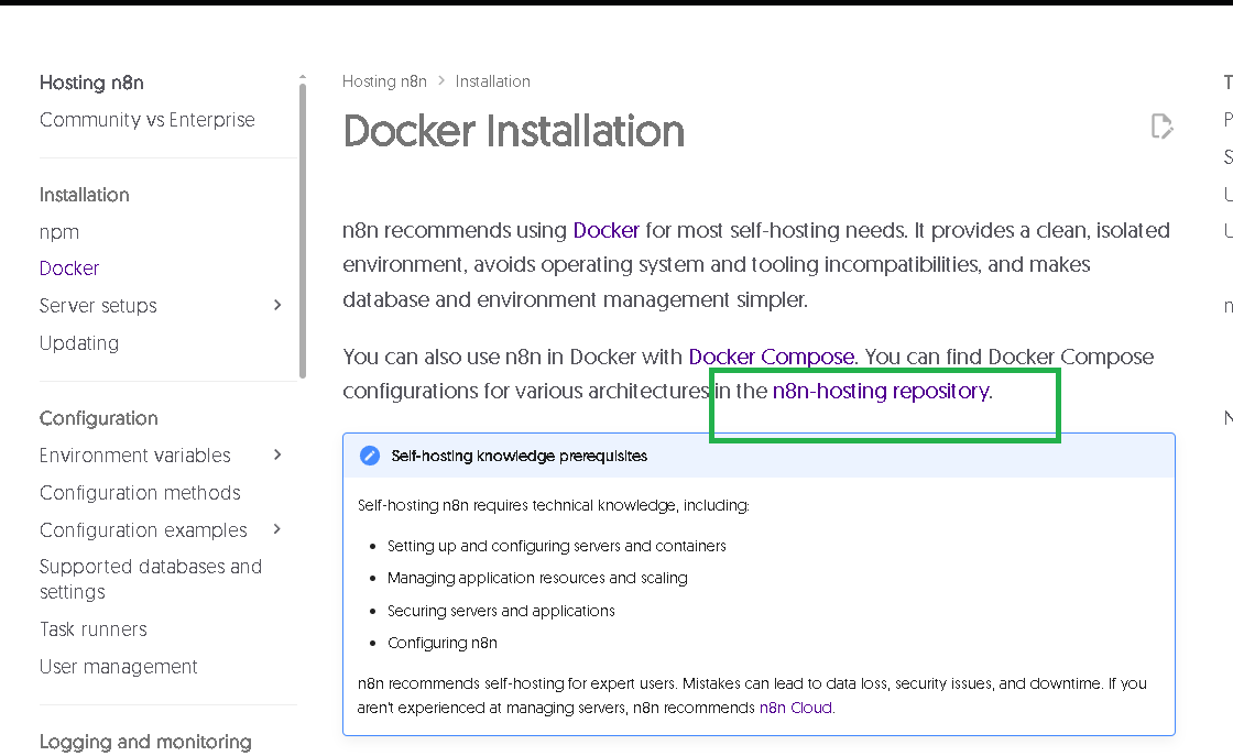 中間有一段 n8n-hosting repository.,我們要從裡面取得 docker-compose.yml 的安裝腳本