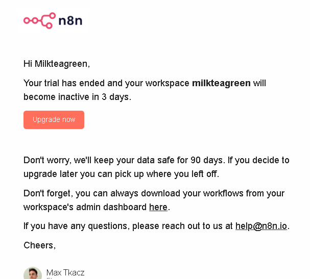 最重要的一點:免費 (n8n Cloud 有 14 天試用期的限制,超過要綁信用卡進行繳費,保留期限為 3 天)